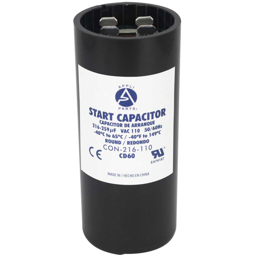 Appli Parts CON-216-110 Capacitor de Arranque 216-259 MFD (microfaradios) uF, 110-125 VAC. Universal para Motores Electricos, condensador de arranque de 3.7 cm de Diametro, 8.6 cm de Alto Compatibilidad Universal: Funciona como reemplazo de cualquier marca con la misma capacidad en microfaradios y el mismo voltaje. Disenado para 110-125 VAC con terminales macho de 1/4 de pulgada. Reemplaza 2MDR6 2MDR7 CAP-216-110 Certificado: Un capacitor tipo CD60 es un capacitor de arranque de motor monofasico, de tipo electrolitico, no polarizado, de alta capacitancia y uso intermitente, disenado para proporcionar un alto par de arranque durante unos segundos al encender el motor. Construccion de Alta Calidad: Fabricado bajo certificacion UL E479187, tipo CD60, libre de PCB para un uso seguro y confiable. Elaborado con materiales resistentes para mayor durabilidad y larga vida util. Especificaciones Tecnicas: Tolerancia de +/-20% de su capacidad nominal. Rango de temperatura de trabajo desde -40C hasta 65C. Frecuencia 50/60 Hz. Dimensiones 3.7 cm de Diametro, 8.6 cm de alto Aplicaciones: Ideal para circuitos de arranque de motores electricos en bombas de agua, bombas de alberca, sierras de mesa, compresores y otras aplicaciones generales. Verifique que las dimensiones y caracteristicas sean similares al producto que esta reemplazando.