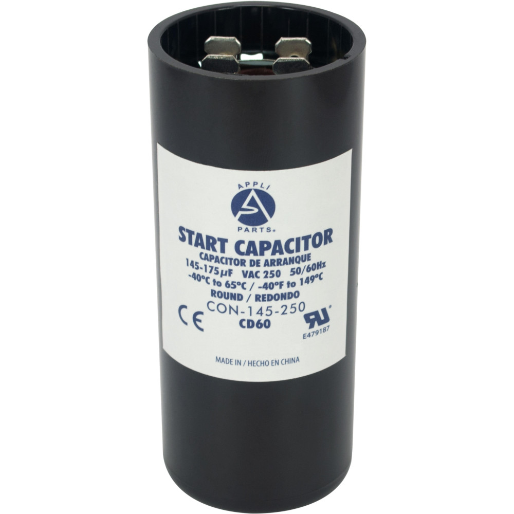 Appli Parts CON-145-250 Capacitor de Arranque 145-175 MFD (microfaradios) uF, 250 VAC. Universal para Motores Electricos, condensador de arranque de 3.7 cm de Diametro, 8.6 cm de Alto Compatibilidad Universal: Funciona como reemplazo de cualquier marca con la misma capacidad en microfaradios y el mismo voltaje. Disenado para 250 VAC con terminales macho de 1/4 de pulgada. Reemplaza 2MET4 44ZU49 CAP-140-250 Certificado: Un capacitor tipo CD60 es un capacitor de arranque de motor monofasico, de tipo electrolitico, no polarizado, de alta capacitancia y uso intermitente, disenado para proporcionar un alto par de arranque durante unos segundos al encender el motor. Construccion de Alta Calidad: Fabricado bajo certificacion UL E479187, tipo CD60, libre de PCB para un uso seguro y confiable. Elaborado con materiales resistentes para mayor durabilidad y larga vida util. Especificaciones Tecnicas: Tolerancia de +/-20% de su capacidad nominal. Rango de temperatura de trabajo desde -40C hasta 65C. Frecuencia 50/60 Hz. Dimensiones 3.7 cm de Diametro, 8.6 cm de alto Aplicaciones: Ideal para circuitos de arranque de motores electricos en bombas de agua, bombas de alberca, sierras de mesa, compresores y otras aplicaciones generales. Verifique que las dimensiones y caracteristicas sean similares al producto que esta reemplazando.