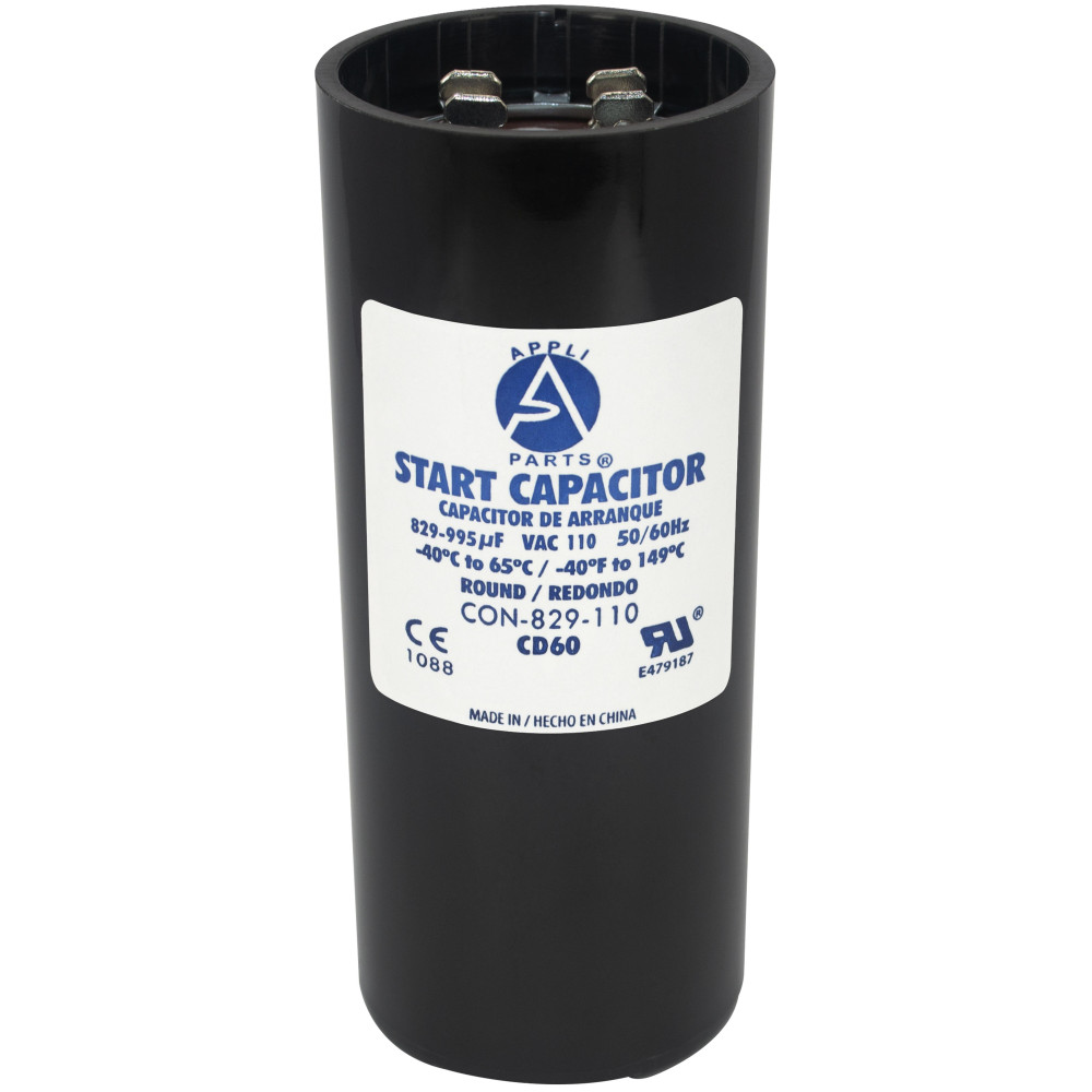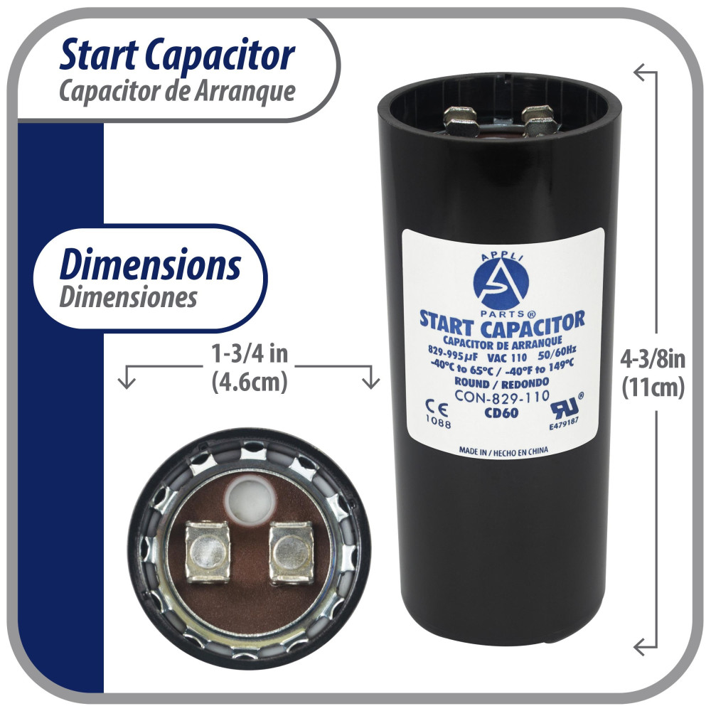 Appli Parts CON-829-110 Capacitor de Arranque 829-995 MFD (microfaradios) uF, 110-125 VAC. Universal para Motores Electricos, condensador de arranque de 4.6 cm de Diametro, 11 cm de Alto Compatibilidad Universal: Funciona como reemplazo de cualquier marca con la misma capacidad en microfaradios y el mismo voltaje. Disenado para 110-125 VAC con terminales macho de 1/4 de pulgada. Reemplaza 6FLL8 CAP-829-110 Certificado: Un capacitor tipo CD60 es un capacitor de arranque de motor monofasico, de tipo electrolitico, no polarizado, de alta capacitancia y uso intermitente, disenado para proporcionar un alto par de arranque durante unos segundos al encender el motor. Construccion de Alta Calidad: Fabricado bajo certificacion UL E479187, tipo CD60, libre de PCB para un uso seguro y confiable. Elaborado con materiales resistentes para mayor durabilidad y larga vida util. Especificaciones Tecnicas: Tolerancia de +/-20% de su capacidad nominal. Rango de temperatura de trabajo desde -40C hasta 65C. Frecuencia 50/60 Hz. Dimensiones 4.6 cm de Diametro, 11 cm de alto Aplicaciones: Ideal para circuitos de arranque de motores electricos en bombas de agua, bombas de alberca, sierras de mesa, compresores y otras aplicaciones generales. Verifique que las dimensiones y caracteristicas sean similares al producto que esta reemplazando.
