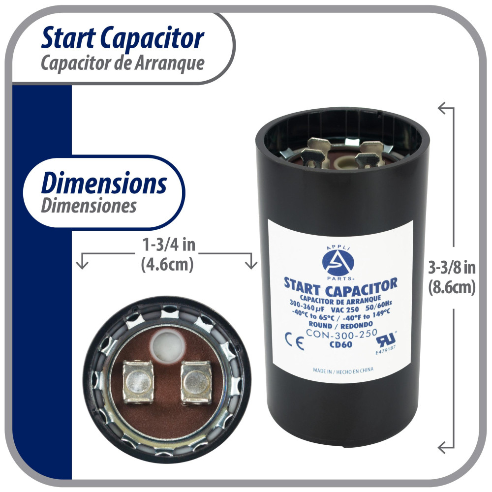 Appli Parts CON-300-250 Capacitor de Arranque 300-360 MFD (microfaradios) uF, 250 VAC. Universal para Motores Electricos, condensador de arranque de 4.6 cm de Diametro, 8.6 cm de Alto Compatibilidad Universal: Funciona como reemplazo de cualquier marca con la misma capacidad en microfaradios y el mismo voltaje. Disenado para 250 VAC con terminales macho de 1/4 de pulgada. Reemplaza 2MEU2 CAP-300-250 Certificado: Un capacitor tipo CD60 es un capacitor de arranque de motor monofasico, de tipo electrolitico, no polarizado, de alta capacitancia y uso intermitente, disenado para proporcionar un alto par de arranque durante unos segundos al encender el motor. Construccion de Alta Calidad: Fabricado bajo certificacion UL E479187, tipo CD60, libre de PCB para un uso seguro y confiable. Elaborado con materiales resistentes para mayor durabilidad y larga vida util. Especificaciones Tecnicas: Tolerancia de +/-20% de su capacidad nominal. Rango de temperatura de trabajo desde -40C hasta 65C. Frecuencia 50/60 Hz. Dimensiones 4.6 cm de Diametro, 8.6 cm de alto Aplicaciones: Ideal para circuitos de arranque de motores electricos en bombas de agua, bombas de alberca, sierras de mesa, compresores y otras aplicaciones generales. Verifique que las dimensiones y caracteristicas sean similares al producto que esta reemplazando.