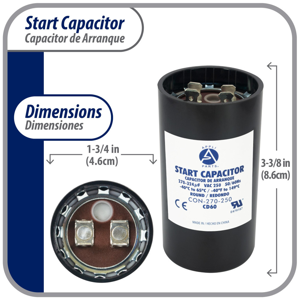 Appli Parts CON-270-250 Capacitor de Arranque 270-324 MFD (microfaradios) uF, 250 VAC. Universal para Motores Electricos, condensador de arranque de 4.6 cm de Diametro, 8.6 cm de Alto Compatibilidad Universal: Funciona como reemplazo de cualquier marca con la misma capacidad en microfaradios y el mismo voltaje. Disenado para 250 VAC con terminales macho de 1/4 de pulgada. Reemplaza 6FLW3 2MEU1 CAP-270-250 Certificado: Un capacitor tipo CD60 es un capacitor de arranque de motor monofasico, de tipo electrolitico, no polarizado, de alta capacitancia y uso intermitente, disenado para proporcionar un alto par de arranque durante unos segundos al encender el motor. Construccion de Alta Calidad: Fabricado bajo certificacion UL E479187, tipo CD60, libre de PCB para un uso seguro y confiable. Elaborado con materiales resistentes para mayor durabilidad y larga vida util. Especificaciones Tecnicas: Tolerancia de +/-20% de su capacidad nominal. Rango de temperatura de trabajo desde -40C hasta 65C. Frecuencia 50/60 Hz. Dimensiones 4.6 cm de Diametro, 8.6 cm de alto Aplicaciones: Ideal para circuitos de arranque de motores electricos en bombas de agua, bombas de alberca, sierras de mesa, compresores y otras aplicaciones generales. Verifique que las dimensiones y caracteristicas sean similares al producto que esta reemplazando.