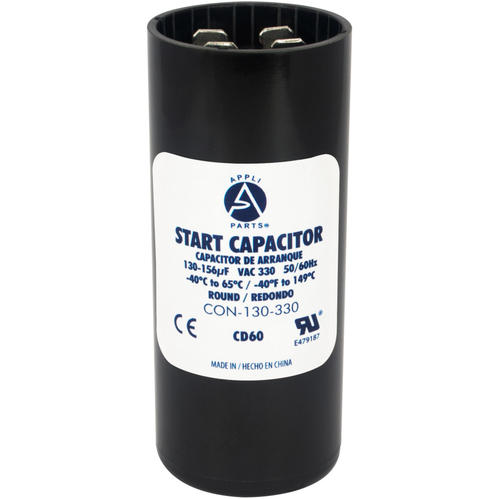Appli Parts CON-130-330 Capacitor de Arranque 130-156 MFD (microfaradios) uF, 330 VAC. Universal para Motores Electricos, condensador de arranque de 3.7 cm de Diametro, 8.6 cm de Alto Compatibilidad Universal: Funciona como reemplazo de cualquier marca con la misma capacidad en microfaradios y el mismo voltaje. Disenado para 330 VAC con terminales macho de 1/4 de pulgada. Reemplaza 2MEP1 CAP-130-330 Certificado: Un capacitor tipo CD60 es un capacitor de arranque de motor monofasico, de tipo electrolitico, no polarizado, de alta capacitancia y uso intermitente, disenado para proporcionar un alto par de arranque durante unos segundos al encender el motor. Construccion de Alta Calidad: Fabricado bajo certificacion UL E479187, tipo CD60, libre de PCB para un uso seguro y confiable. Elaborado con materiales resistentes para mayor durabilidad y larga vida util. Especificaciones Tecnicas: Tolerancia de +/-20% de su capacidad nominal. Rango de temperatura de trabajo desde -40C hasta 65C. Frecuencia 50/60 Hz. Dimensiones 3.7 cm de Diametro, 8.6 cm de alto Aplicaciones: Ideal para circuitos de arranque de motores electricos en bombas de agua, bombas de alberca, sierras de mesa, compresores y otras aplicaciones generales. Verifique que las dimensiones y caracteristicas sean similares al producto que esta reemplazando.