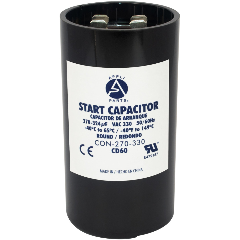 Appli Parts CON-270-330 Capacitor de Arranque 270-324 MFD (microfaradios) uF, 330 VAC. Universal para Motores Electricos, condensador de arranque de 4.6 cm de Diametro, 8.6 cm de Alto Compatibilidad Universal: Funciona como reemplazo de cualquier marca con la misma capacidad en microfaradios y el mismo voltaje. Disenado para 330 VAC con terminales macho de 1/4 de pulgada. Reemplaza 2MEP6 CAP-270-330 Certificado: Un capacitor tipo CD60 es un capacitor de arranque de motor monofasico, de tipo electrolitico, no polarizado, de alta capacitancia y uso intermitente, disenado para proporcionar un alto par de arranque durante unos segundos al encender el motor. Construccion de Alta Calidad: Fabricado bajo certificacion UL E479187, tipo CD60, libre de PCB para un uso seguro y confiable. Elaborado con materiales resistentes para mayor durabilidad y larga vida util. Especificaciones Tecnicas: Tolerancia de +/-20% de su capacidad nominal. Rango de temperatura de trabajo desde -40C hasta 65C. Frecuencia 50/60 Hz. Dimensiones 4.6 cm de Diametro, 8.6 cm de alto Aplicaciones: Ideal para circuitos de arranque de motores electricos en bombas de agua, bombas de alberca, sierras de mesa, compresores y otras aplicaciones generales. Verifique que las dimensiones y caracteristicas sean similares al producto que esta reemplazando.