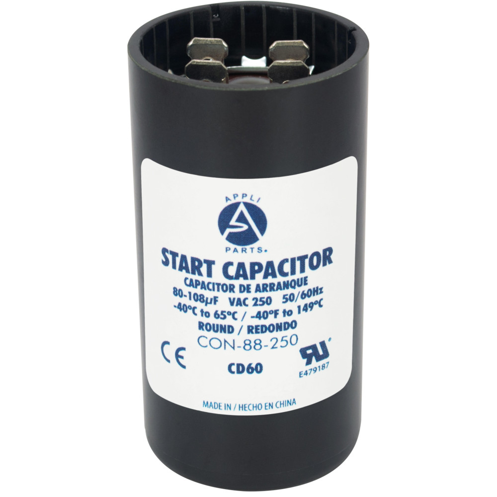 Appli Parts CON-88-250 Capacitor de Arranque 80-108 MFD (microfaradios) uF, 250 VAC. Universal para Motores Electricos, condensador de arranque de 3.7 cm de Diametro, 7 cm de Alto Compatibilidad Universal: Funciona como reemplazo de cualquier marca con la misma capacidad en microfaradios y el mismo voltaje. Disenado para 250 VAC con terminales macho de 1/4 de pulgada. Reemplaza 44ZU50 CAP-88-250 Certificado: Un capacitor tipo CD60 es un capacitor de arranque de motor monofasico, de tipo electrolitico, no polarizado, de alta capacitancia y uso intermitente, disenado para proporcionar un alto par de arranque durante unos segundos al encender el motor. Construccion de Alta Calidad: Fabricado bajo certificacion UL E479187, tipo CD60, libre de PCB para un uso seguro y confiable. Elaborado con materiales resistentes para mayor durabilidad y larga vida util. Especificaciones Tecnicas: Tolerancia de +/-20% de su capacidad nominal. Rango de temperatura de trabajo desde -40C hasta 65C. Frecuencia 50/60 Hz. Dimensiones 3.7 cm de Diametro, 7 cm de alto Aplicaciones: Ideal para circuitos de arranque de motores electricos en bombas de agua, bombas de alberca, sierras de mesa, compresores y otras aplicaciones generales. Verifique que las dimensiones y caracteristicas sean similares al producto que esta reemplazando.