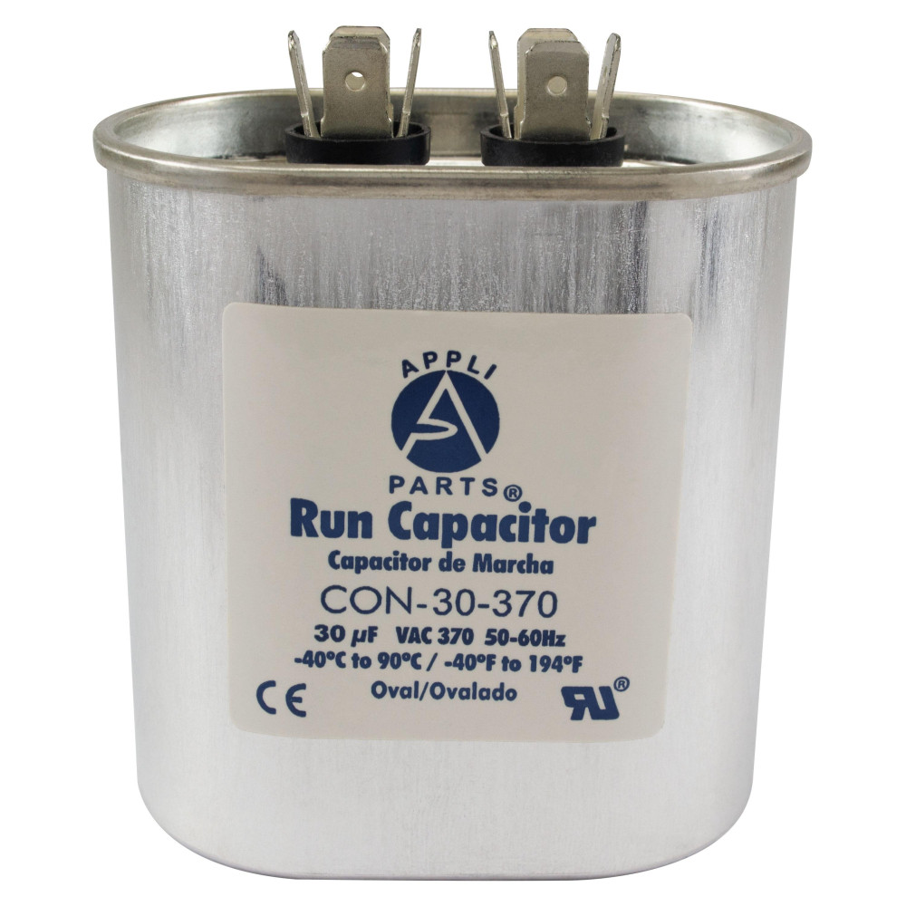 Appli Parts CON-30-370 Condensador Capacitor de Marcha 30 Mfd uF (microfaradios) 370VAC CBB65 Universal Aire acondicionado y otras aplicaciones Ovalado UL, 5.1cm Ancho 2.5cm Profundidad 7.6cm Alto Universal: Remplaza cualquier marca con la misma capacitancia y capacidad. Funciona con 370V. Conectores de 1/4 pulg Garantia: Certificado ULE476928 , Fabricado sin PCB. Remplaza: TOC30 12017 12917 POC30A CAP-30-370 Especificaciones: Tolerancia de +/- 5% de su capacidad, Rango de temperatura de trabajo -40C (-40F) a +90C (+194F), 50/60 Hz. Dimensiones 8.3 cm H, 4.5 cm A, 7.3 cm L Proteccion: Protegido para 10,000AFC, lo que significa que este producto no estalla si por alguna razon hay cortocircuitos Verifique que las dimensiones y otras caracteristicas del producto sean similares al producto original que esta remplazando