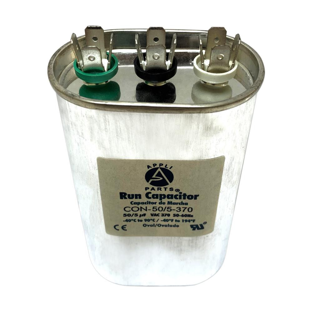 Appli Parts CON-50/5-370 Condensador Capacitor de Marcha 50+5 Mfd uF (microfaradios) 370VAC CBB65 Universal Aire acondicionado y otras aplicaciones Ovalado UL, 5.1cm Ancho 2.5cm Prof 10.2cm Alto Universal: Remplaza cualquier marca con la misma capacitancia y voltaje. Funciona con 370V. Conectores de 1/4 pulg Garantia: Certificado UL E476928 , Fabricado sin PCB. Remplaza: TOCD505 12138 12838 POCD505A CAP-50/5-370 Especificaciones: Tolerancia de +/- 5% de su capacidad, Rango de temperatura de trabajo -40C (-40F) a +90C (+194F), 50/60 Hz Dimensiones 11.8 cm H, 4.5 cm A, 7 cm L Proteccion: Protegido para 10,000AFC, lo que significa que este producto no estalla si por alguna razon hay cortocircuitos Verifique que las dimensiones y otras caracteristicas del producto sean similares al producto original que esta remplazando