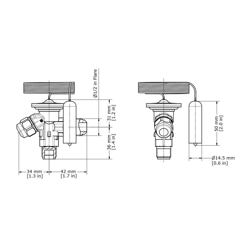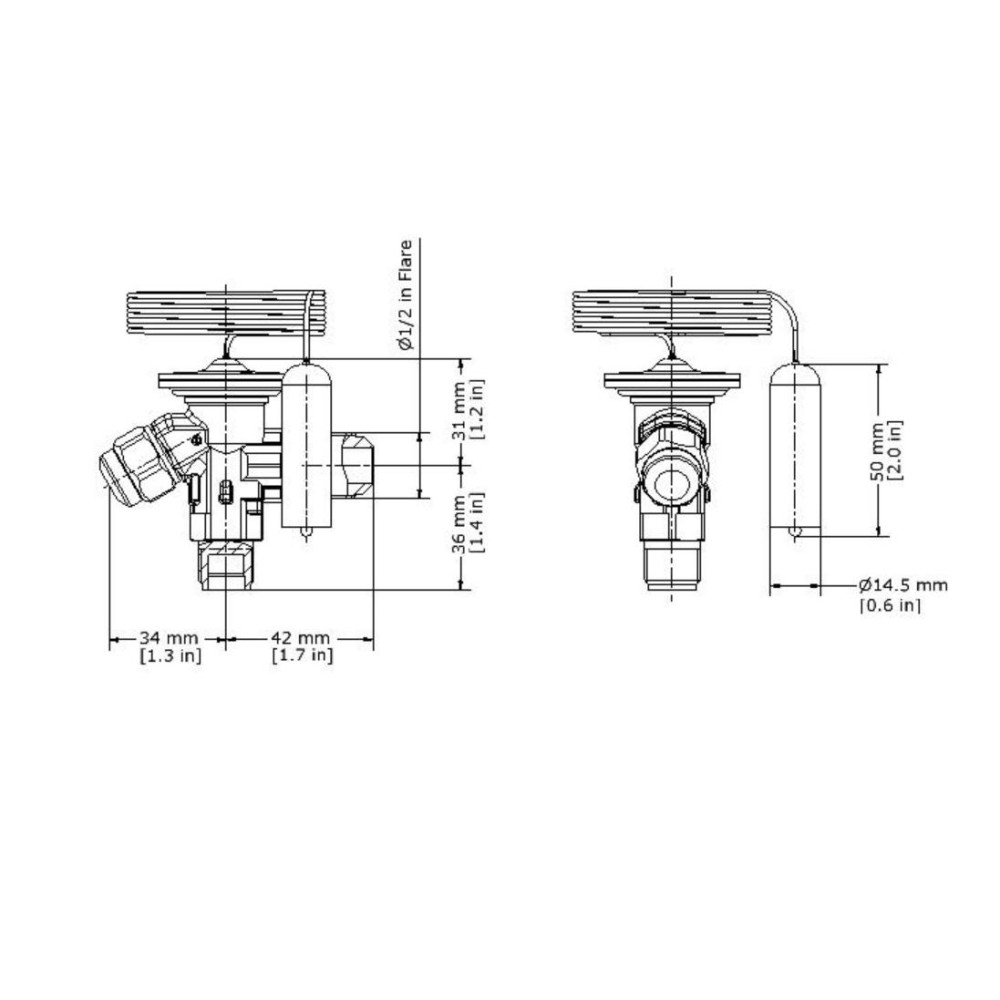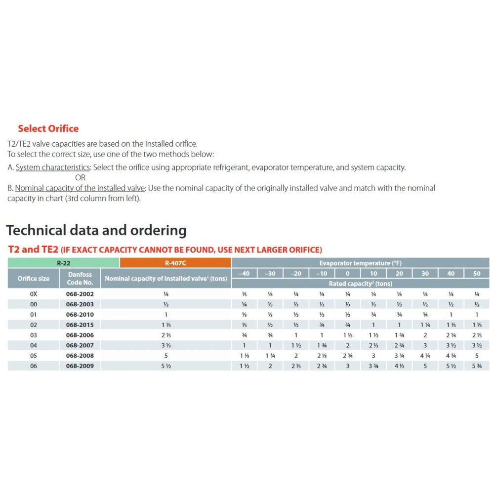 Danfoss 068Z3206 1/4 - 5.5TR Cuerpo de Valvula de Expansion, T 2, R22,R407C, 3/8x1/2 pulg, Flare Roscable, Ecualizacion Interna, Single-flow, -40 a 10C, Capacidad determinada Segun Orficio, 0608Z3466