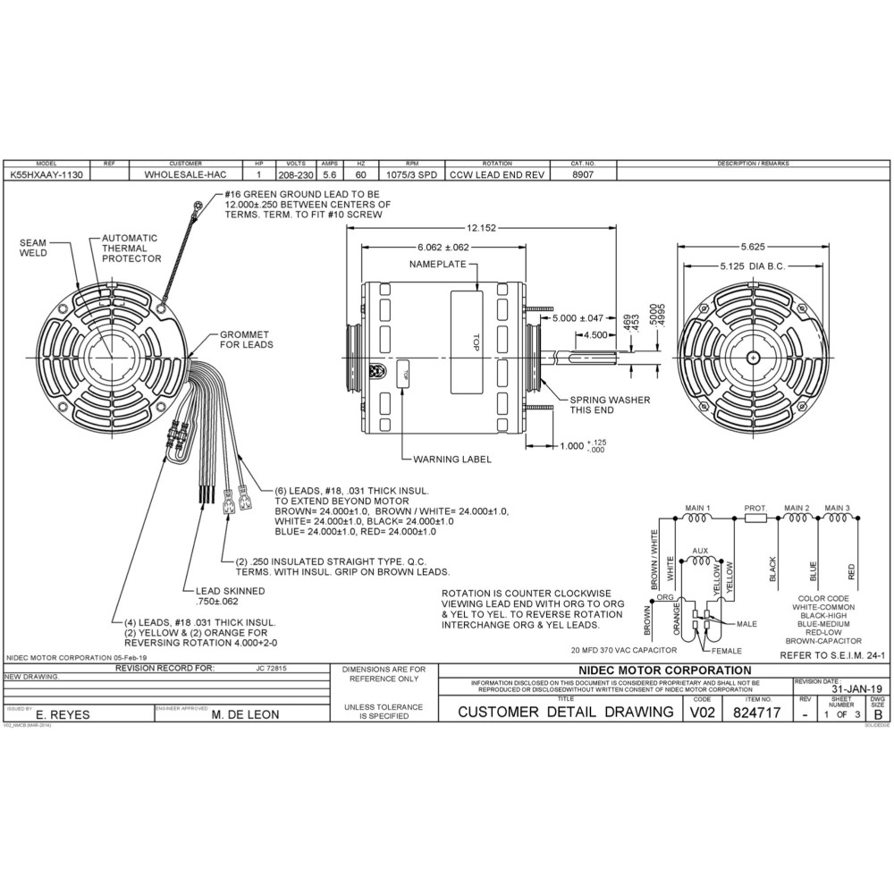 US Motors 8907 Motor 1 HP 1075 RPM 208-230 V 1 Ph OAO 3 Velocidades, Marco 5.6, Eje 1/2 in, Rotacion CCW Reversible, 6 Polos, Incluye Capacitor de Marcha 20 MFD 370 VAC, K055TAK8137012B