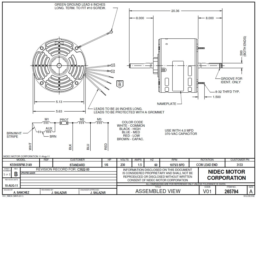US Motors 1/6 hp 1075 rpm, 6 polos, 2 eje, ODP Cerramiento, 3 velocidades, 5.6 diametro, CCW, Lead End 230v, 60 hz, 1 ph, 4 mfd/370 VAC Capacitor 3133 K055SPM3149801N Remplazadop por 3134