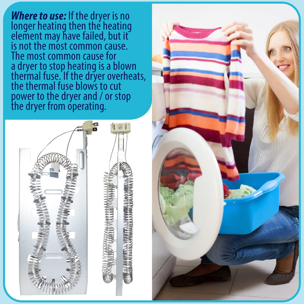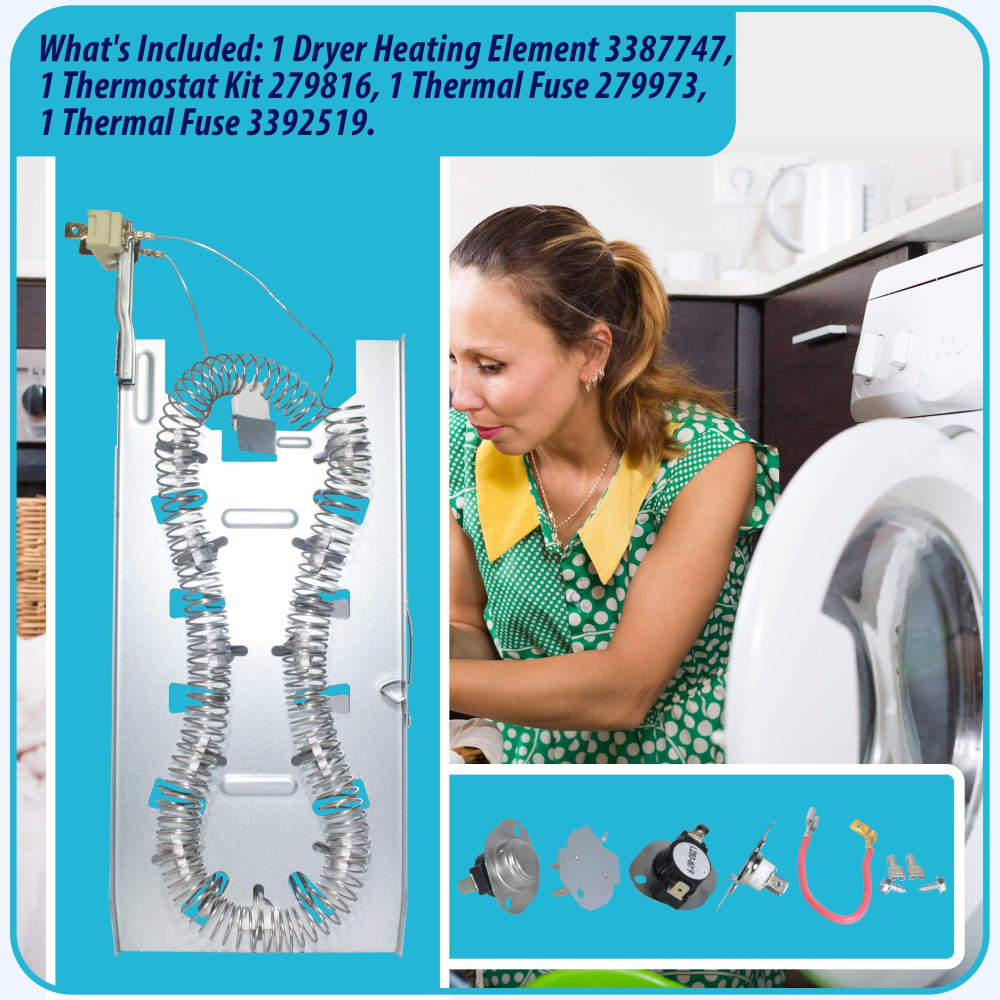 Juego Completo: 1 Elemento Calefactor 3387747, 1 Kit De Termostato 279816, 1 Fusible Termico 279973 Y 1 Fusible Termico 3392519Multimarca: El reemplazo del elemento calefactor se adapta a la mayoria de las mejores marcas (Kenmore, Samsung, Whirlpool, Kitchenaid Electric Dryers y mas)Remplazo Rapido: Para completar esta reparacion, solo necesitara una llave para tuercas y un par de alicates de punta finaCalentamiento Rapido: El Alambre Enrollado En El Elemento Calefactor Recibe Y Resiste Una Corriente Electrica Controlada Del Secador, Que Permite Que El Alambre Se Caliente. El Calor Producido Se Utiliza Para Secar La Ropa En La Secadora.Verifique que las dimensiones y otras caracteristicas del producto sean similares al producto original que esta remplazandoPeso : 0.7257472 KG